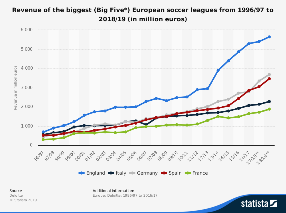 The Premier League has the highest revenues of any professional football league in the world. In one of the league’s few competitive balancing schemes, the league’s massive television revenue is split between the 20 teams. All 20 teams receive $46 Million for domestic (English) TV income, $54 Million for overseas TV income and $6.4 Million for central commercialization. All told, the last placed team in the 2017/18 season, West Bromwich Albion, received nearly $125 Million from television money and prize money. The amount of money floating around the Premier League is, quite frankly, ridiculous. According to accounting firm, Deloitte (who has put out the list of most valuable football clubs every year since 2002), 13 of the top 30 most valuable clubs in the world are English. Sevilla and Lyon, who routinely play in latter stages of prestigious European competitions, lag behind perennial Premiership bottom-feeder, Crystal Palace.